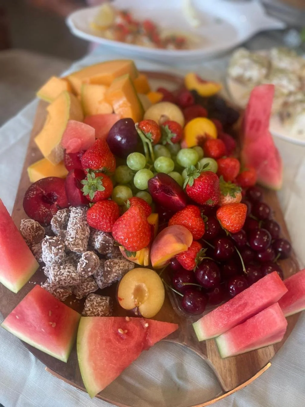 The birthday cake was a stunning masterpiece topped with fresh fruit and flowers - Rachelle had spent a few days creating it with much joy and pride. The team were willing to accommodate requests - our playlist on the speaker, microphone for a speech, decorations, and fun! The 50 or so guests (including kids) loved the indoor and outdoor atmosphere and had wonderful comments about the spread.